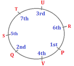 P, Q, R, S, T, U and V are seven players, who play for the same team. In a match meeting, they all are sitting around a circular table facing to the center. Also each player has to complete his training, which is assigned to them. No two player can complete their training at the same time and no two adjacent player finish their training immediately one after the other.