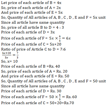 Directions (7-10): Read the passage given below and answer the following questions. In a market there are six types of articles, i.e, ( A, B , C , D , E and F) in same quantity but price of each type of articles is different. If price of each article of A is 50% less than of price of each article of B and 60% less than price of each article of E. Whereas the price of each article of E is same as the quantity of all article of A.
