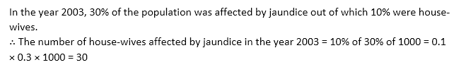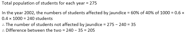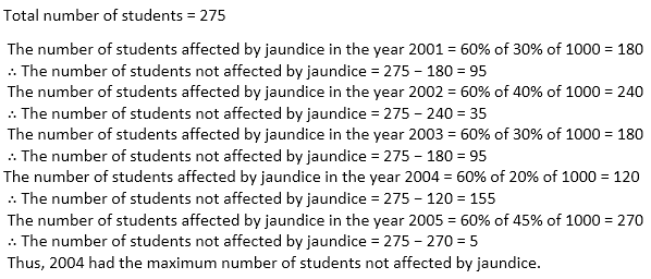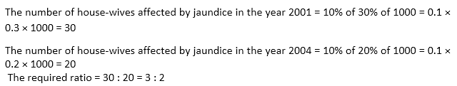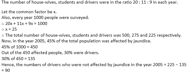 Every year, a survey of 1000 people is conducted by the World Health Organization (WHO). WHO found that in the year 2001, 2002, 2003, 2004 and 2005 the percentage of people affected by jaundice were 30%, 40%, 30%, 20% and 45% respectively. WHO also found that every year out of the affected people 60% were students, 10% were house-wives and 30% were drivers. The number of house-wives, students and drivers were in the ratio 20 : 11 : 9, every year.