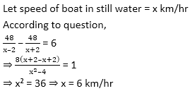 Q9. A boat takes 6 hours more time to cover upstream distance of 48 km than that in downstream. If speed of current is 2 km/hr, then speed of boat in still water is:
