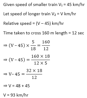 Q6. Two trains of length 160 m and 120 m are running on parallel line in same direction and train with length of 120 m is travelling at a speed of 45 km/hr. The longer train cross a man seating in smaller train in 12 sec. Find the speed of longer train ?