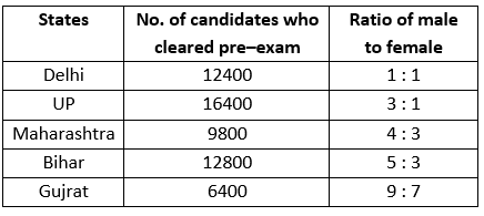 Directions (6-10): The following table shows the total no. of candidates who has cleared the SBI Clark prelims exam 2018 and ratio of male to female in them from five different states of India. Study the table carefully to answer the following questions.