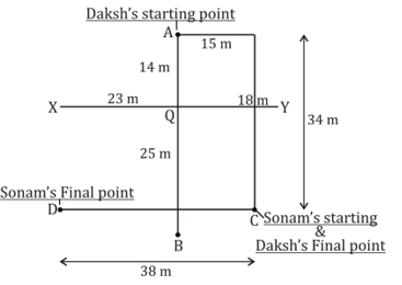 While facing towards south direction on point A, Daksh takes his left and walks 15m and then he takes a right turn and walks 34m and reached to point C. While facing towards south direction from point C, Sonam takes her right and walks 38m and reacho point D.