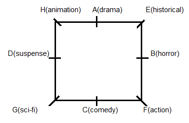 There are eight persons namely A, B, C, D, E, F, G and H who all are sitting around a square table facing towards the center . They all like different genres of movies i.e. horror, comedy, action, animation, suspense, drama, sci-fi & historical but not necessarily in the same order. Four of them are sitting at the corners and rest in the middle of the sides.