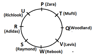 Eight persons P, Q, R, S, T, U, V and W are sitting around a circular table facing towards the centre of the table. Each of them has wear different brand cloths viz. Zara, Levis, Adidas, Rebook, Raymond, Mufti, Woodland, Richlook, but not necessarily in the same order.