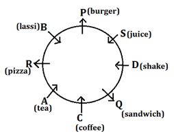 (ii)- A does not like any food Items. The one who like shake sits second to the right of the one who likes burger. R is not an immediate neighbor of P and likes some food. Only two persons sit between the one who likes pizza and the one who likes juice. By using this condition case-2 will be eliminated. S neither likes Shake nor Lassi. Hence S likes juice and B likes lassi, the final arrangement is-