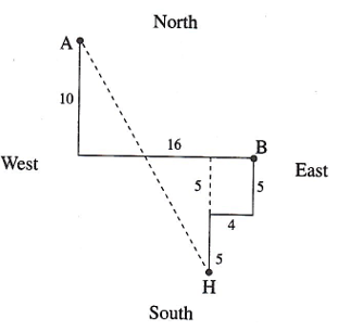 From point H, Ankur starts to walk in north direction and covers a distance of 5 meters then after he takes a right turn and covers a distance of 4 meters and finally takes a left turn and covers a distance of 5 meters and reaches at point B. From point A, Harsh starts to walk in south direction and covers a distance of 10 meters then he takes a left turn and covers a distance of 16 meters and reaches at point B.