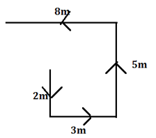 Harsh starts walking in north direction for 5m then he turns to his left and covers a distance of 8 m and then turns right and walk for 3m and again takes a right turn and stops after walking 6m.
