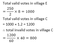Q33. If the difference of valid votes of male and female of village E is 250 and total number of valid votes in village C is 20% more than total votes in village E. Then find the total invalid votes in village C?