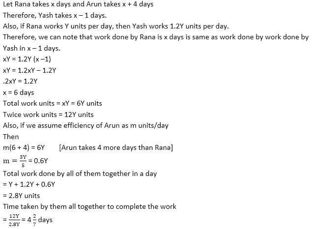 Q1. Arun takes 4 more days than Rana to complete a work. Yash is 20% more efficient than Rana and takes 1 less day Rana takes. Find the number of days taken by all of them to complete twice this work together?