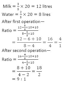 Q11. A 20 litres mixture contains milk and water in the respective ratio of 3 : 2. Then 10 litres of the mixture is removed and replaced with pure milk and the operation is repeated once more. At the end of the two removals and replacements, what is the ratio of milk and water in the resultant mixture respectively ?