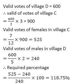 Q34. If the average of valid votes of male in village A and Village D is 280 and the average of invalid votes of Village A and D is 520. Then find the percentage of valid votes of female in village A with respect to valid votes of female in village D?(Total votes in village A is 500)
