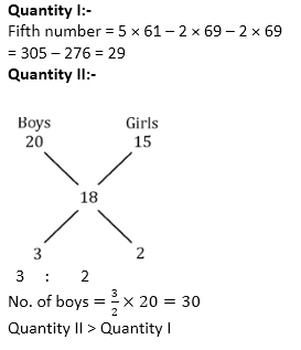 Q10. Quantity I: Value of fifth number when Average of five numbers is 61. The average of 1st and 3rd number is 69 and average of second and fourth number is 69.