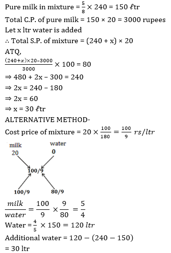 Q8. A mixture of 240 liters contains milk and water in the respective ratio of 5 : 3. A milkman mixes some more water in it and claim to sell it at cost price. If cost price of pure milk is Rs. 20/liter and water is freely available and milkman made a total profit of 80% on cost price of pure milk then find amount of water he mixed in the milk.