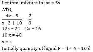 Q7. A jar contains mixture of liquid P and Q in the ratio 4 : 1. If 10ℓ of mixture taken out and same amount of liquid Q poured into jar the ratio becomes 2 : 3 then find how many liters of liquid P contained in jar initially ?