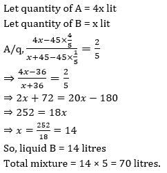 Q10. A container contains a mixture of two liquids A and B in the proportion 4 : 1. If 45 litres of the mixture is replaced by 45 litres of liquid B, then the ratio of the two liquids becomes 2 : 5 in the container. How much of the liquid B initially was there in the container? What quantity does the container hold initially?