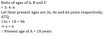 Q6. At present, the respective ratio between the ages of A and B is 3 : 4 and that between A and C is 1 : 2. Six years hence, the sum of ages of A, B and C will be 96 years. What is the present age of A ?
