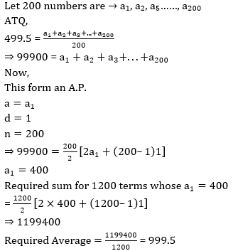 Q9. Average of any 200 consecutive natural numbers is 499.5. If next 1000 numbers more are added in it then find the new average.