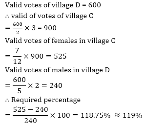 Q2. If the ratio of valid votes of village C and D together is 3 : 2 respectively. Then valid votes of females in village C is approximately what percent more than valid votes of male in village D? [Given that valid votes of females in village D is 50% more than that of male in village D]
