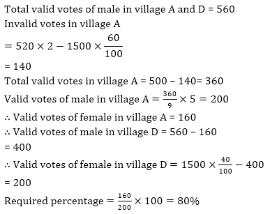 Q4. If the average of valid votes of male in village A and Village D together is 280 and the average of invalid votes of Village A and D together is 520. Then find the percentage of valid votes of female in village A with respect to valid votes of female in village D?(Total votes in village A is 500)