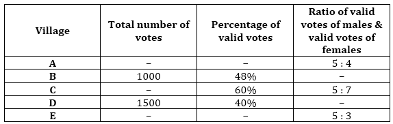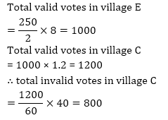 Q3. If the difference of valid votes of male and female of village E is 250 and total number of valid votes in village C is 20% more than total valid votes in village E. Then find the total invalid votes in village C?