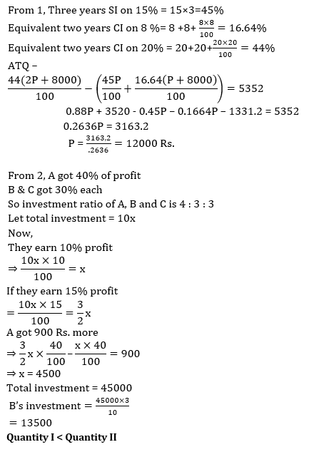 Q6. Quantity I: Value of P. Manoj lend Rs. P for three years on S.I. at the rate of 15% per annum and Rajesh lend Rs. (P + 8000) for two years on C.I. at the rate of 8% per annum. Suresh borrowed sum equal to what Manoj and Rajesh lend, for two years on C.I. at the rate of 20% per annum. Suresh paid interest Rs. 5352 more.