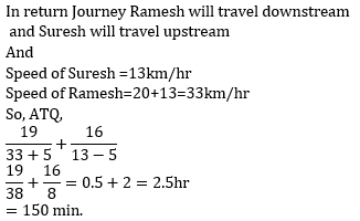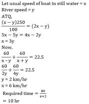 Q8. A boat cover 60 km upstream and 60 km downstream in 22.5 hr with its usual speed. If boat double its speed, then new upstream speed is 150% more than the usual upstream speed. Find the time taken by boat to cover 80 km in downstream with usual speed.
