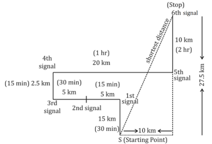 All children driving the cars inside the amusement park should compulsorily follow the traffic signals and can’t go outside the park to drive the car. A girl Ankita who is facing north, drive the car at the speed of 30 km per hour inside the park and encounters the signals in the following manners. (She can go to the next signal only after passing the previous signal)