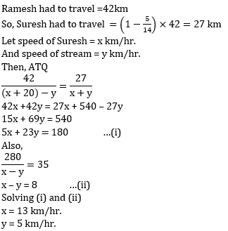 Directions (9-10): Ramesh and Suresh decided to meet at a common point at the same time in the river. Ramesh had to travel 42 km upstream in the river and Suresh had to travelless distance downstream than that of Ramesh to meet at a common point. They both sets off in their respective boats at the same time and speed of Ramesh’s boat is 20 km/hr more than the speed of Suresh boat. It is given that Suresh covers 280 km upstream in 35 hours.