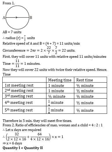 Q7. Quantity I: No. of times A and B meet together in 5 minutes. Two persons A and B are standing diametrically opposite on a circular track with a radius of 3.5 units. They start running in an opposite direction on the circular track and their speeds are 4 units/minute and 7 units/minute respectively. On meeting each other they take rest for half a minute and then start running with twice the original speed.