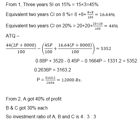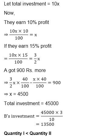 Quantity II: Investment of B. A, B and C entered into a partnership with some investment for one year. After one-year A got 2/5 profit and B and C got equal part of remaining profit. If total profit after one year is 15% instead of 10% of total investment made by them, then A got 900 Rs. more.