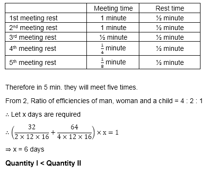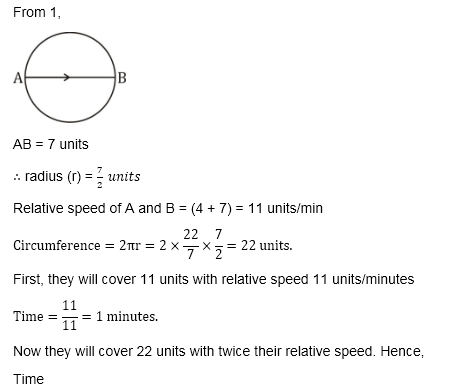 Q7. Quantity I: No. of times A and B meet together in 5 minutes. Two persons A and B are standing diametrically opposite on a circular track with a radius of 3.5 units. They start running in an opposite direction on the circular track and their speeds are 4 units/minute and 7 units/minute respectively. On meeting each other they take rest for half a minute and then start running with twice the original speed.