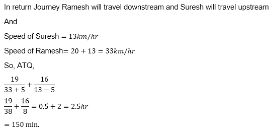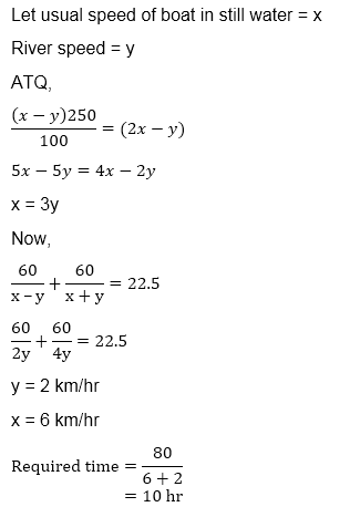 Q8. A boat cover 60 km upstream and 60 km downstream in 22.5 hr with its usual speed. If boat double its speed then new upstream speed is 150% more than the usual upstream speed. Find the time taken by boat to cover 80 km in downstream with usual speed.