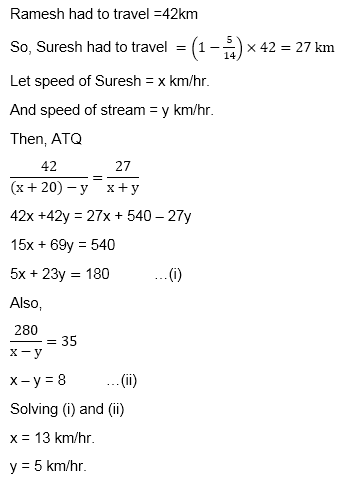 Directions (9-10): Ramesh and Suresh decided to meet at a common point at the same time in the river. Ramesh had to travel 42 km upstream in the river and Suresh had to travelless distance downstream than that of Ramesh to meet at a common point. They both sets off in their respective boats at the same time and speed of Ramesh’s boat is 20 km/hr more than the speed of Suresh boat. It is given that Suresh covers 280 km upstream in 35 hours.