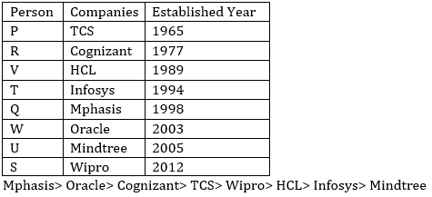 Three companies were started between Cognizant and Oracle. Cognizant had been started in an odd numbered year before Oracle. T works in Infosys. HCL started after TCS. Only three companies earn more revenue than TCS. Company which earns just more revenue than TCS was started in a year Just after TCS. Only two companies established between TCS and Infosys. Company which earns highest revenue was started in an even numbered year. Company in which U works earn least revenue. Infosys has been started in an even number year. V works in HCL which established in 1989. Company in which W works earns less revenue than only one company. Company which started third earn third lowest revenue. W neither works in Wipro and Mphasis. Company in which V works earn less revenue than Wipro which does not earn highest revenue. Company which started in year 1994 does not earn highest revenue. R does not work in a company which earns highest revenue. Mphasis established before wipro. Q does not work in the company which was started last and U and R does not work in Wipro. Mindtree started in an odd numbered year. P works before T but does not work in cognizant. Oracle earns more revenue than Cognizant but less than Mphasis. Infosys earns more revenue than the company in which U works but less than Wipro.