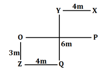 A person starts walking from point X in west direction and walks 4m and reached at point Y. From point Y he takes a left turn and walks 6m to reach at point Q. Then he takes a right turn and walks 4m to reach at point Z, then turn his right and walks 3m and reached at point O. From point O, he walks 8m east and stop at point P.