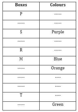 Some boxes are arranged one above another. Box R is immediately above box M, which is of Blue color. Only two boxes are there in between Orange box and box T. Orange box is above box T. There is only one box in between box P and box S. Box S is of Purple color and is placed above box R. There are three boxes in between Orange box and Green box. Green box is placed below T. Only one box is placed in between box R and Orange box. More than four boxes are placed in between box P and Orange box. Not more than two boxes are placed in between box M and box S.