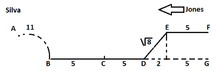 Two friends Silva and Jones started walking from two different points. Silva, who started from point A moved along a circular track and after walking 11km he reached point B, from where he turned left and walked 5km to reach point C after which he stopped. Jones started from point F towards west direction and after walking 5km, he reached point E. From point E he turned 45 degree towards his left and walked √8 km to reach point D. After reaching point D, he turned 45 degrees in clockwise direction. He then moved ahead 5km to reach point C which is towards the west of point D. Point B, C and D are in straight line.