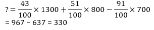 Q11. 43% of 1300 + 51% of 800 = ? + 91% of 700