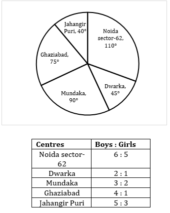Directions (6-10): the pie-chart given below shows the angular distribution (in degrees) of students to whom various centers for IBPS RRB PO were allotted. The table shows the ratio of boys and girls in them. Study the graphs carefully to answer the following questions.