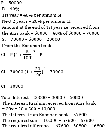 Q3. If the rate of interest was interchanged i.e. Axis bank had offered R% per annum simple interest and Bandhan bank had offered 20% per annum compound interest, then how much less money Krishan would have received at the end of 3 years?