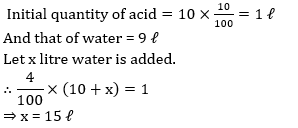 Q9. The ratio of the quantities of an acid and water in a mixture is 1 : 3. If 5 litres of Acid is further added to the mixture, the new ratio becomes 1 : 2. The quantity of new mixture in litres is