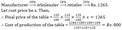 Q14. If the manufacturer gains 10% after selling an article to the whole-sale dealer, whole sale dealer sold it to retailer at 15% profit and the retailer sold it at 25% profit, then find the cost of production of that article, if the retailer got Rs. 1265 after selling the article.