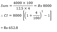 Q12. The simple interest on a certain sum for 4 yrs at a rate of 12.5% per annum is Rs 4000. What will be the compound interest on the same sum at a rate of 4% per annum after two years?