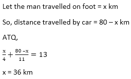 Q6. A man travelled a distance of 80 km in 13 hours. He travelled some distance on foot with speed 4 kmph and remaining by car with speed 11 kmph what is the distance travelled by him on foot.