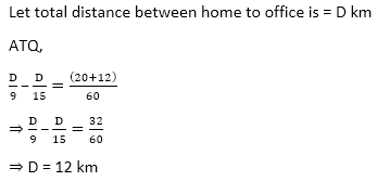 Q8. Prince reaches office from home 12 minute before if he goes with speed of 15 kmph. He reaches office 20 minute late if he travels with speed 9 kmph. Find the distance between his office to home.