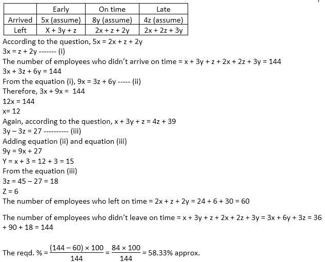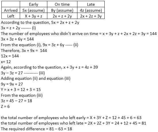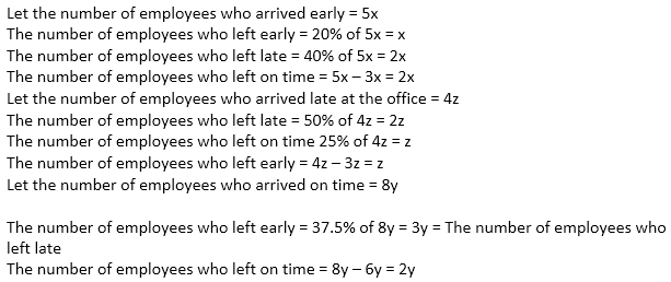One day, in an SBI Branch the attendance of all the employees was 100% but all the employees were not punctual to the office nor did all the employees stayed till the end of the office time. On that day, of all the employees who arrived early at the office, 20% of them left early but 40% of them left late and rest of them left on time. Of the employees who arrived late at the office, 50% of them left late but 25% of them left on time and rest of them left early. Of the employees who arrived on time, 37.5% of them left early and an equal number of them left late but rest of them left on time. The number of employees who arrived early was equal to the number of employees who left on time and the number of employees who left early was 39 more than the number of employees who arrived late at the office. The number of employees who didn’t leave on time was 144.