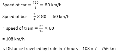 Q7. The ratio between the speed of a bus and train is 15 : 27 respectively. Also, a car covers a distance of 720 km in 9 hours. The speed of the bus is three-fourth of the speed of the car. How much distance will the train cover in 7 hours?