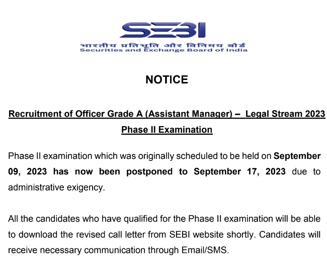 Securities and Exchange Board Of India has released an important notice regarding the recruitment of Officer Grade A(Assistant Manager)-Legal Stream 2023 Phase II Examination. As mentioned in the PDF, originally the Phase II Exam was scheduled to be conducted on 09 September 2023 which has been now revised to 17 September 2023. Here, we have provided the direct link to download the PDF for SEBI Grade A 2023.