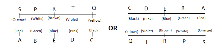 Directions (1-5): Read the following information carefully and answer the questions given below: There are total ten persons divided in two groups. In each group there is equal number of person. They sit in two rows while they are in meeting. One group faces north while other group faces south. In group 1- There are five persons A,B,C,Dand E and in the Group2-There are five persons P,Q,R,S and T. All of them like different colour like Pink, Red, Blue, Black, White, Green, Yellow, Violet, Brown and Orange but not necessarily in the same order. P sits third to right of Q. Immediate neighbor of Q faces the person who like pink colour. There is gap of two persons between the person who like pink and red colour. There is only one person between R and S. R does not like red. And R does not face the person who like red colour. T does not face the person who like red colour. Immediate neighbor of P faces the person who like blue colour. E likes blue colour. There is only one person between E and the person who like Black colour. The person who like white colour faces the person who likes the green colour. There are gap of two persons between the person who likes the white and yellow colour. The person who likes the violet colour is not immediate nighbour of person who likes white colour. A likes red colour and sits third to left of D. B does not like black colour. R likes brown colour.